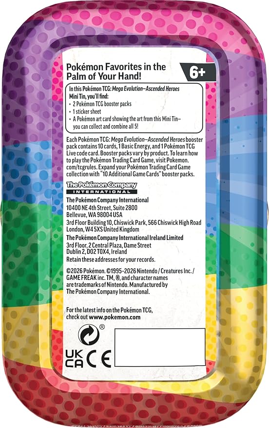 This is an English language product. Pokémon favorites in the palm of your hand! Contains 2 Pokémon TCG: Mega Evolution—Ascended Heroes booster packs. (Each booster pack contains 10 game cards, 1 Basic Energy, and 1 Pokémon TCG Live code card. Cards vary by pack.) Inside this tin you will also find 1 sticker sheet and a Pokémon art card showing the art from this Mini Tin—you can collect and combine all 5! Celebrate the stars of Scarlet & Violet and the dawn of Mega Evolution.